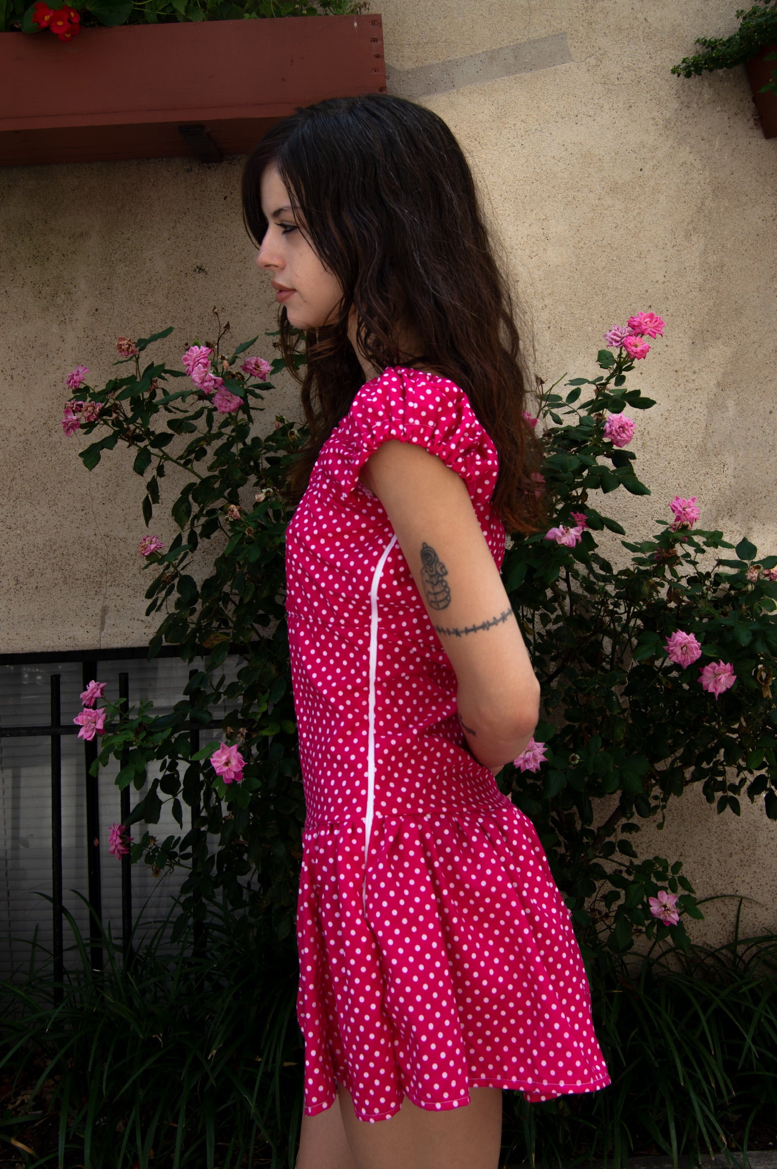 Made from secondhand bedsheets, this one of a kind mini dress is polka dot perfection!
