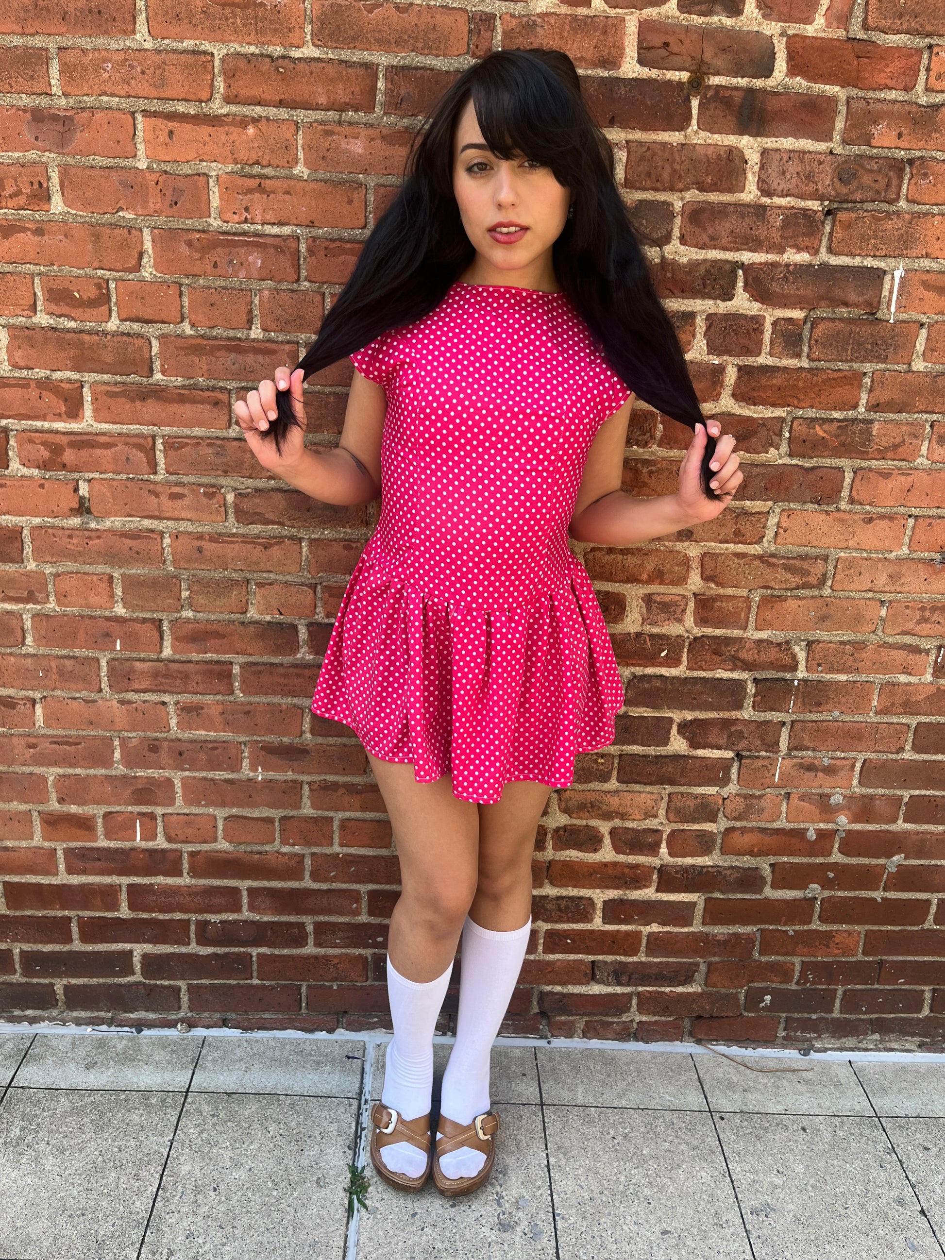 Made from secondhand polka dot bed sheets, the silhouette of this dress compliments the vintage fabric perfectly!